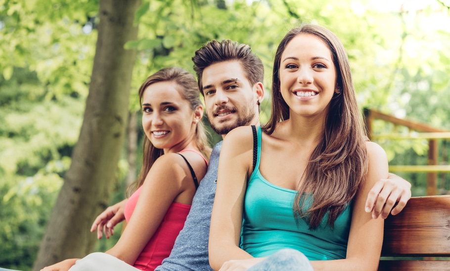Smiling teenagers relaxing at the park during a summer day, they are sitting on a wooden bench and looking at camera